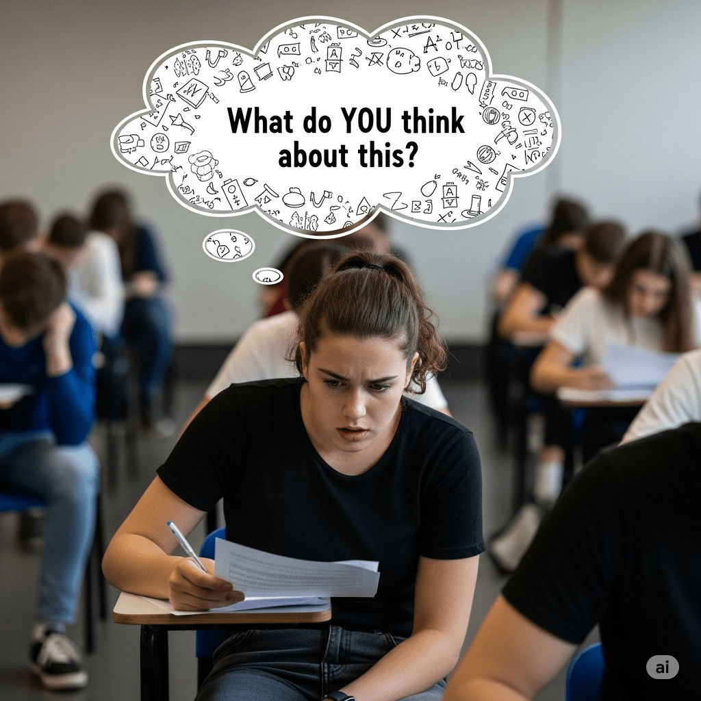 „ამაზე რას ფიქრობთ?“ შეკითხვაც კი არაა, უფრო შეკითხვის თავიდან აცილებაა. იგი უარს ამბობს მოლოდინების ზუსტად ჩამოყალიბებაზე, აცდენილია აკადემიურ კატეგორიებს და ინტერპრეტაციის ტვირთს მთლიანად ჰკიდებს მოსწავლეს, რომელიც ხშირ შემთხვევაში B1 დონისაც არ არის და ჯერ კიდევ უჭირს სამიზნე ენაში მაგალითის, არგუმენტის და ანალიზის ერთმანეთისგან გარჩევა.